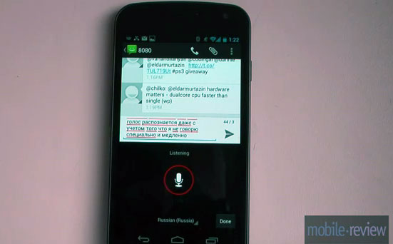 Главный редактор Mobile Review Эльдар Муртазин опубликовал короткое видео с демонстрацией возможностей голосового набора текста на русском языке в смартфоне Galaxy Nexus с установленной операционной системой Android 4.0.